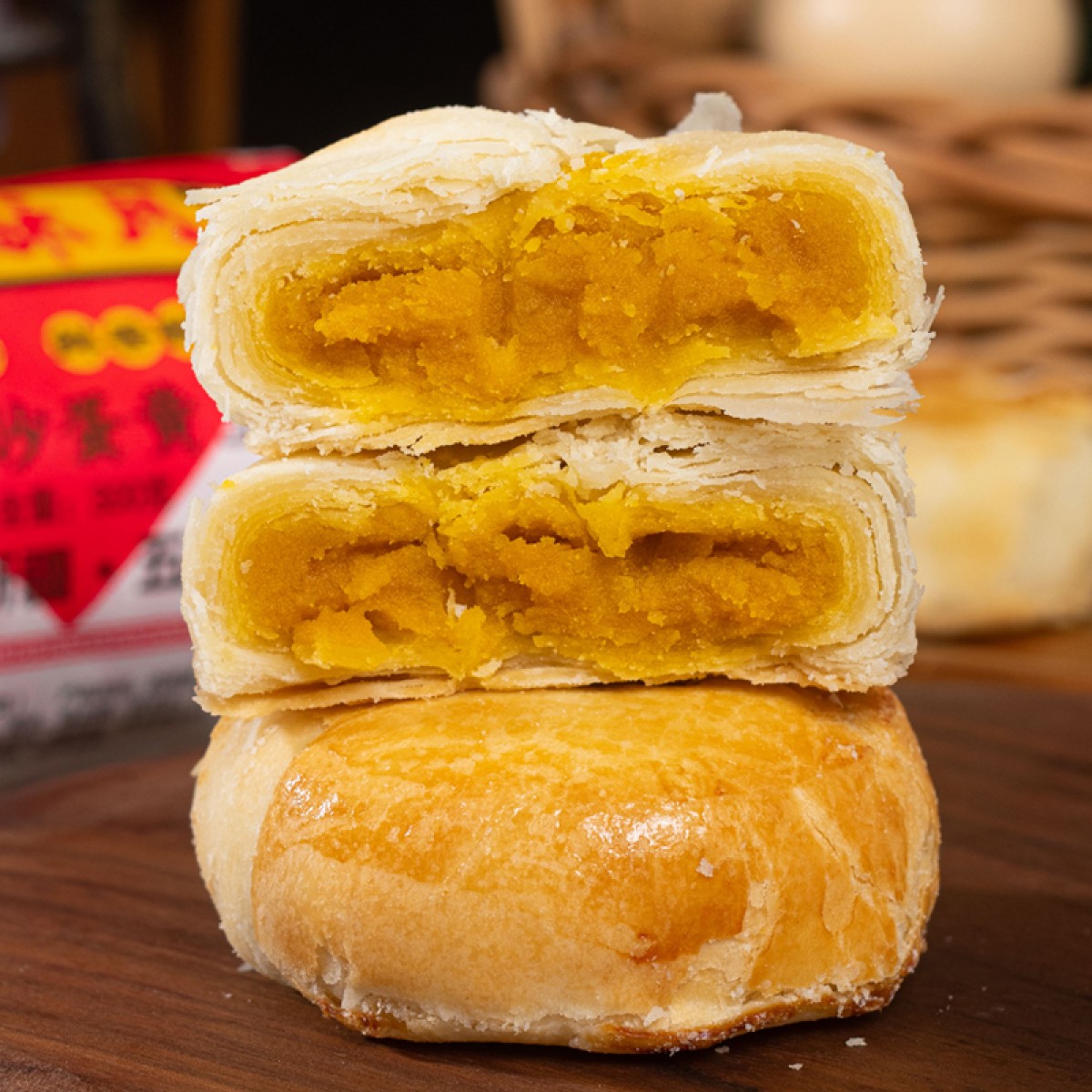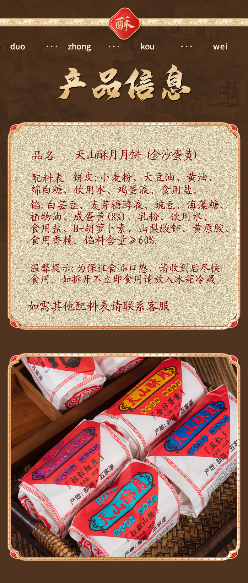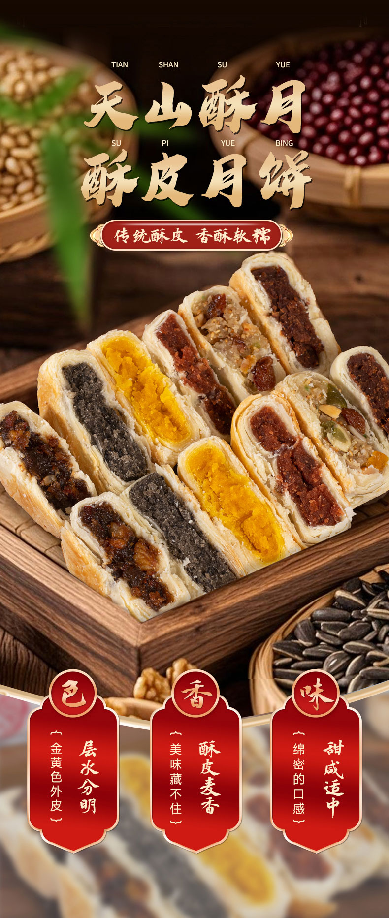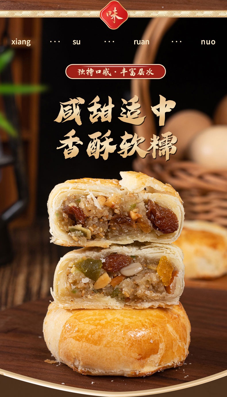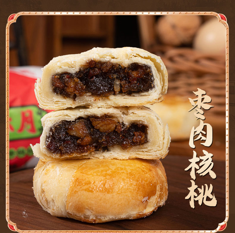 商品名称:盼月新疆天山酥月酥皮月饼传统糕点枣肉核桃红豆伍仁金沙蛋黄中秋300g*3筒