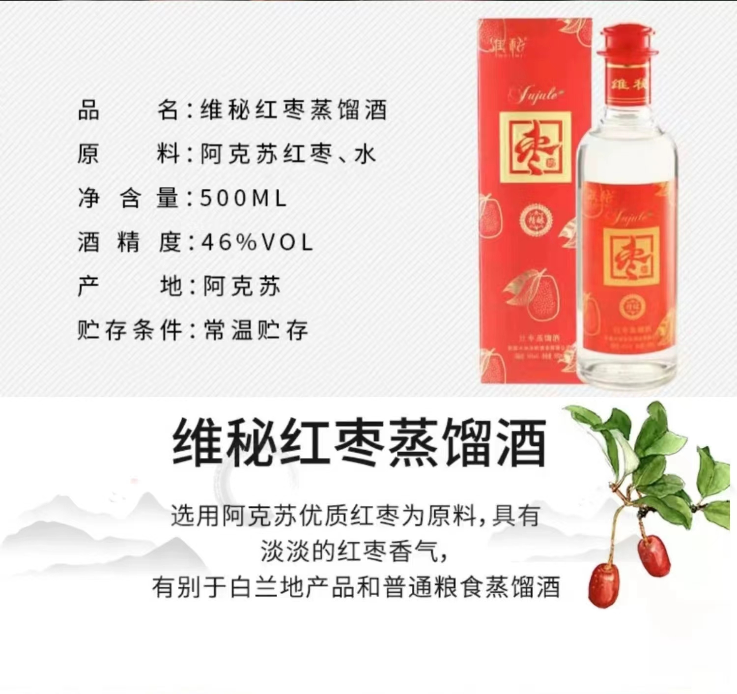 商品名称:新疆阿克苏红枣蒸馏酒新疆特产维秘46度500ml瓶装