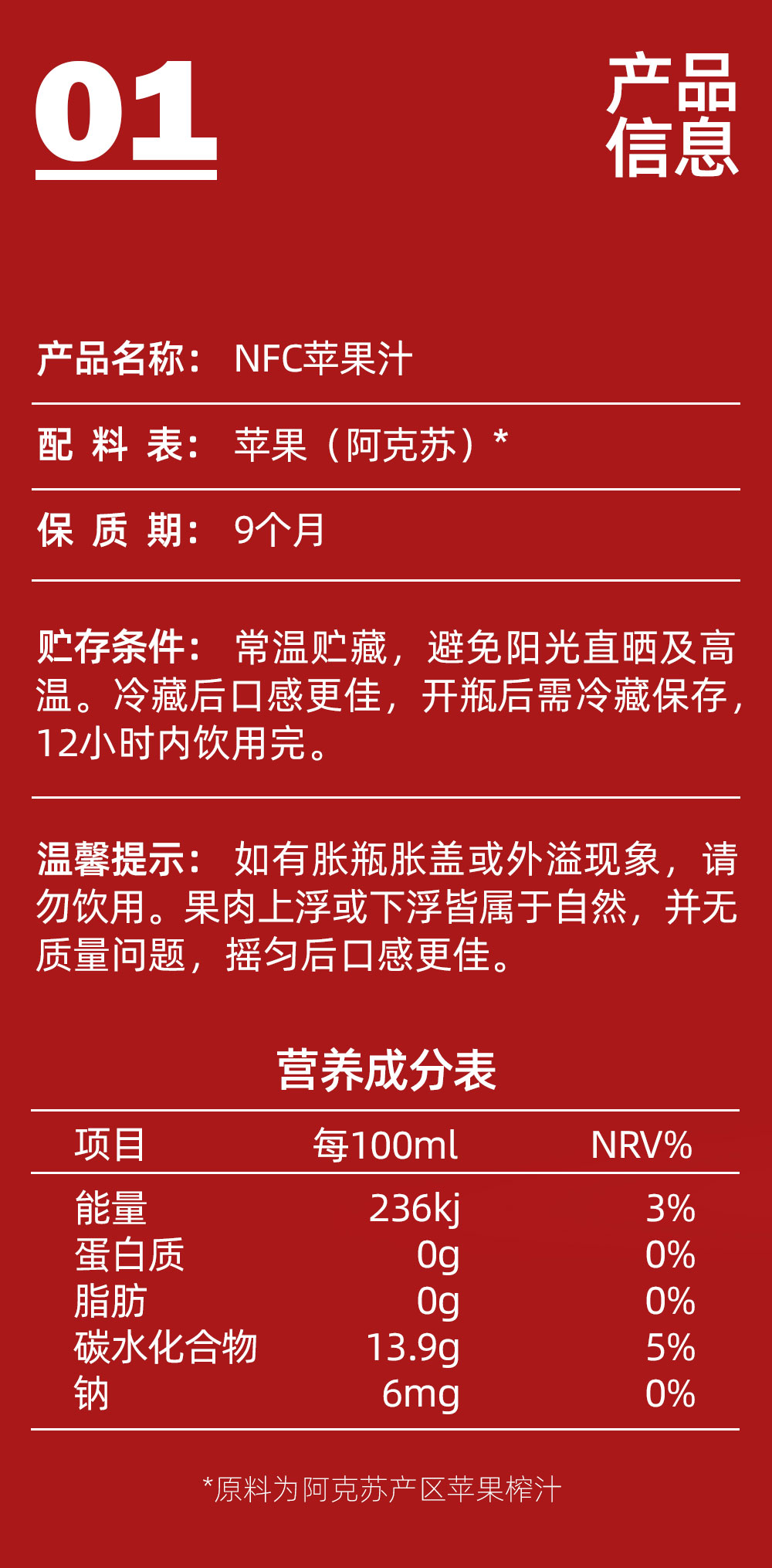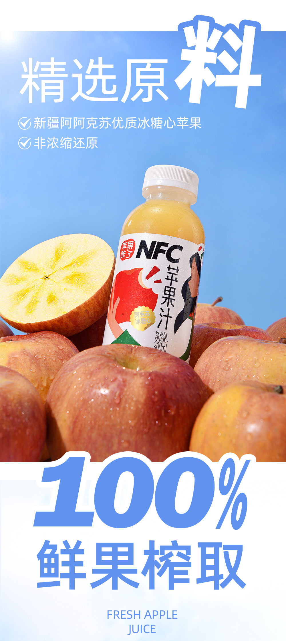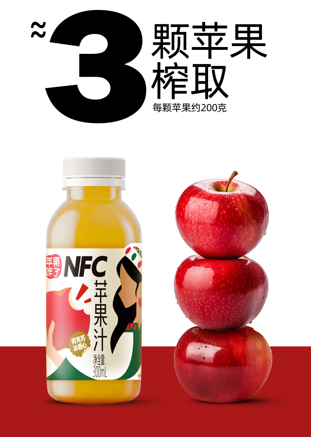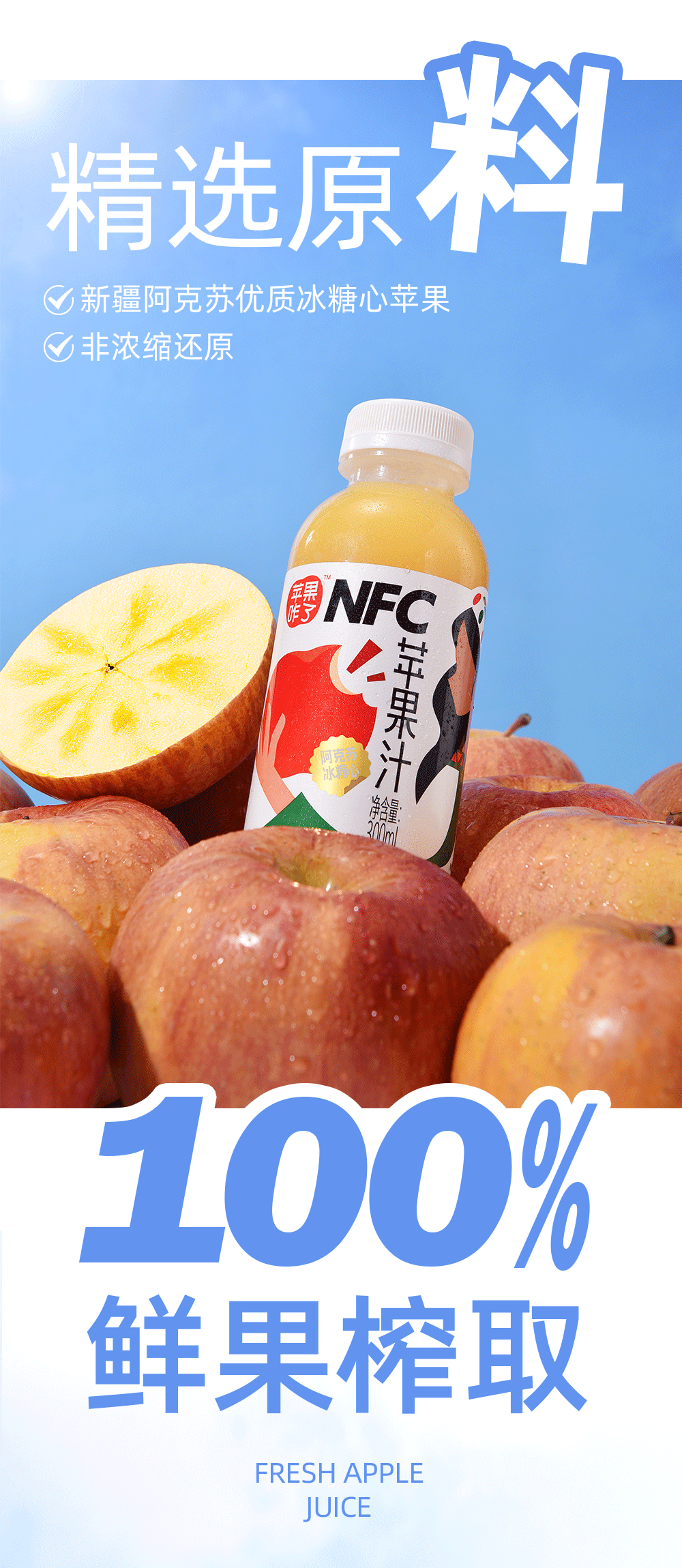 商品名称:【阿克苏产地直发】新疆阿克苏冰糖心NFC鲜榨苹果汁无添加果汁300ml*8瓶