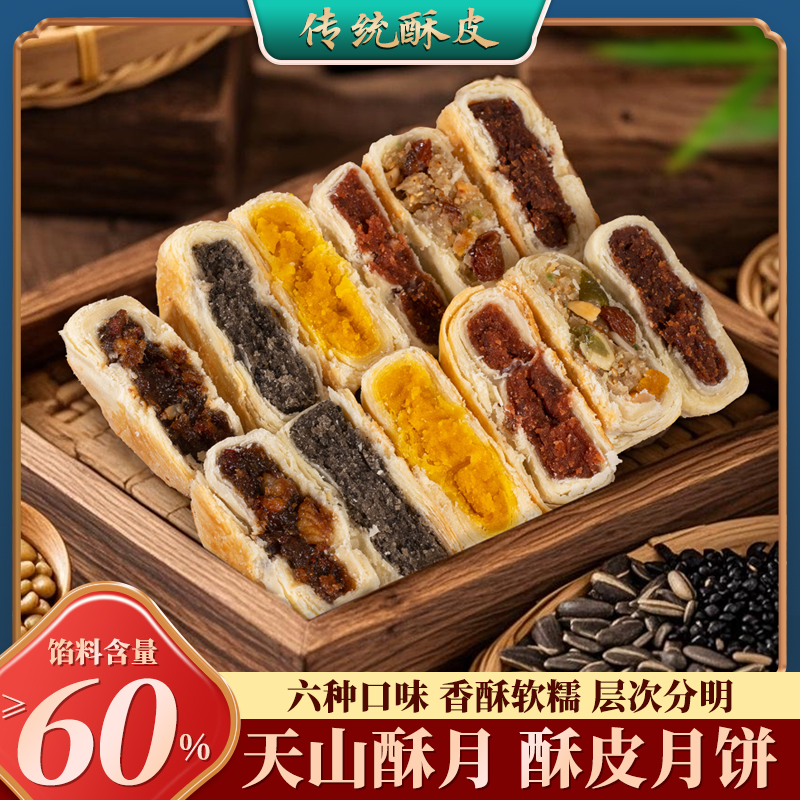 盼月新疆天山酥月酥皮月饼传统糕点枣肉核桃红豆伍仁金沙蛋黄中秋300g*3筒